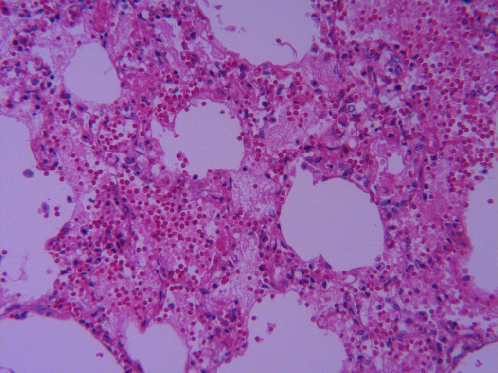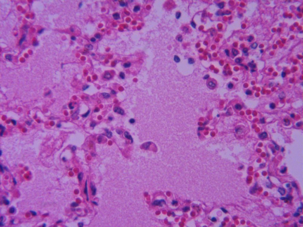 肺泡腔有大量淡红染的浆液和纤维素,并可见数量不等的红细胞和肺泡壁上皮细胞。