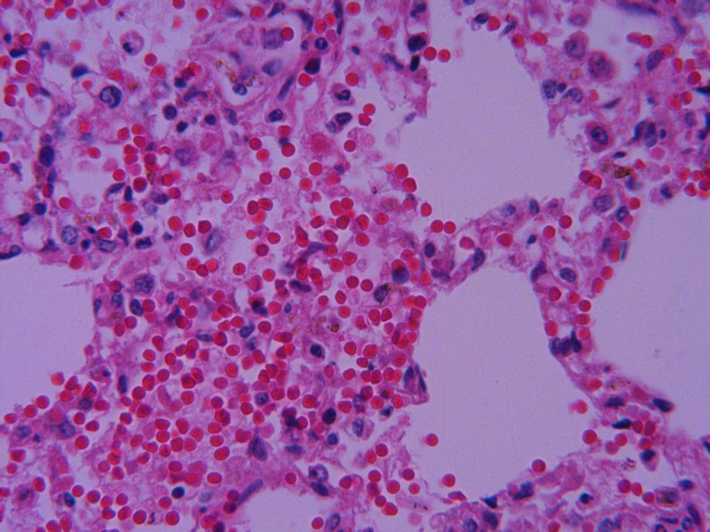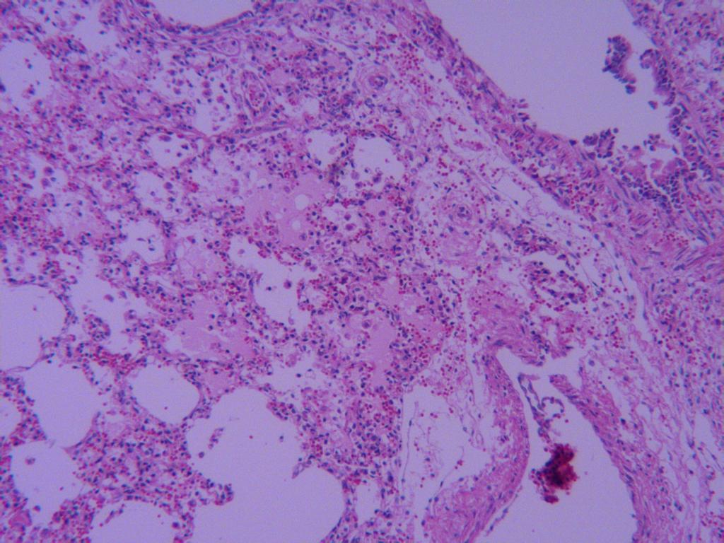 肺泡腔有大量红染的浆液,肺泡壁毛细血管扩张充血。