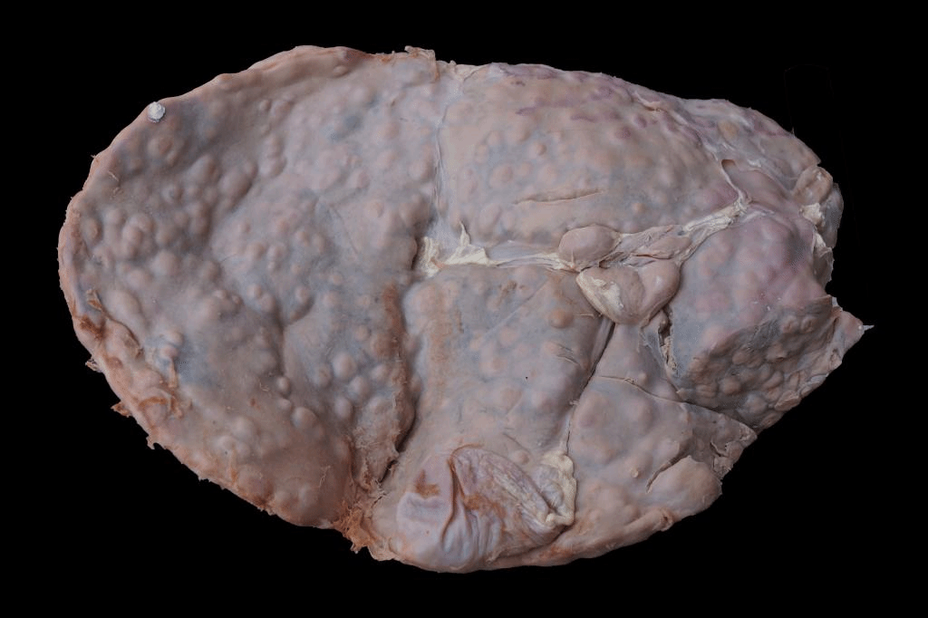 (使用说明:载入后标本会自动旋转,鼠标单击图片任意位置可暂停旋转;标本回到初始界面后,可通过用鼠标点击左右方向键(< >)手动旋转标本;标本初始界面标注有注释热点(,鼠标指针悬停此处后即可查看对该部位病变的注解;可用鼠标点击控制栏中的放大或缩小按钮对标本视图界面进行无损缩放,也可用鼠标滚轮进行缩放。注:若未能正常加载,请下载安装Adobe Flash Player。